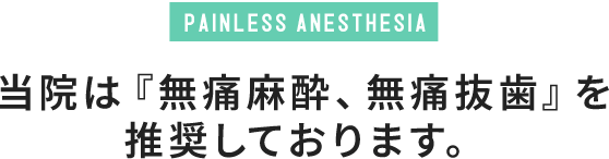 「歯科治療は、麻酔が痛くて怖い!!」と思っている方も多いのではないでしょうか?治療の痛みを無くすための麻酔にも関わらず、麻酔が痛くては意味がないですよね。当院では、治療前の麻酔注射時における痛み・不快感を軽減するため、『無痛麻酔』を実践しております。麻酔の痛みを抑えて、患者様の恐怖心を和らげることを心がけています。