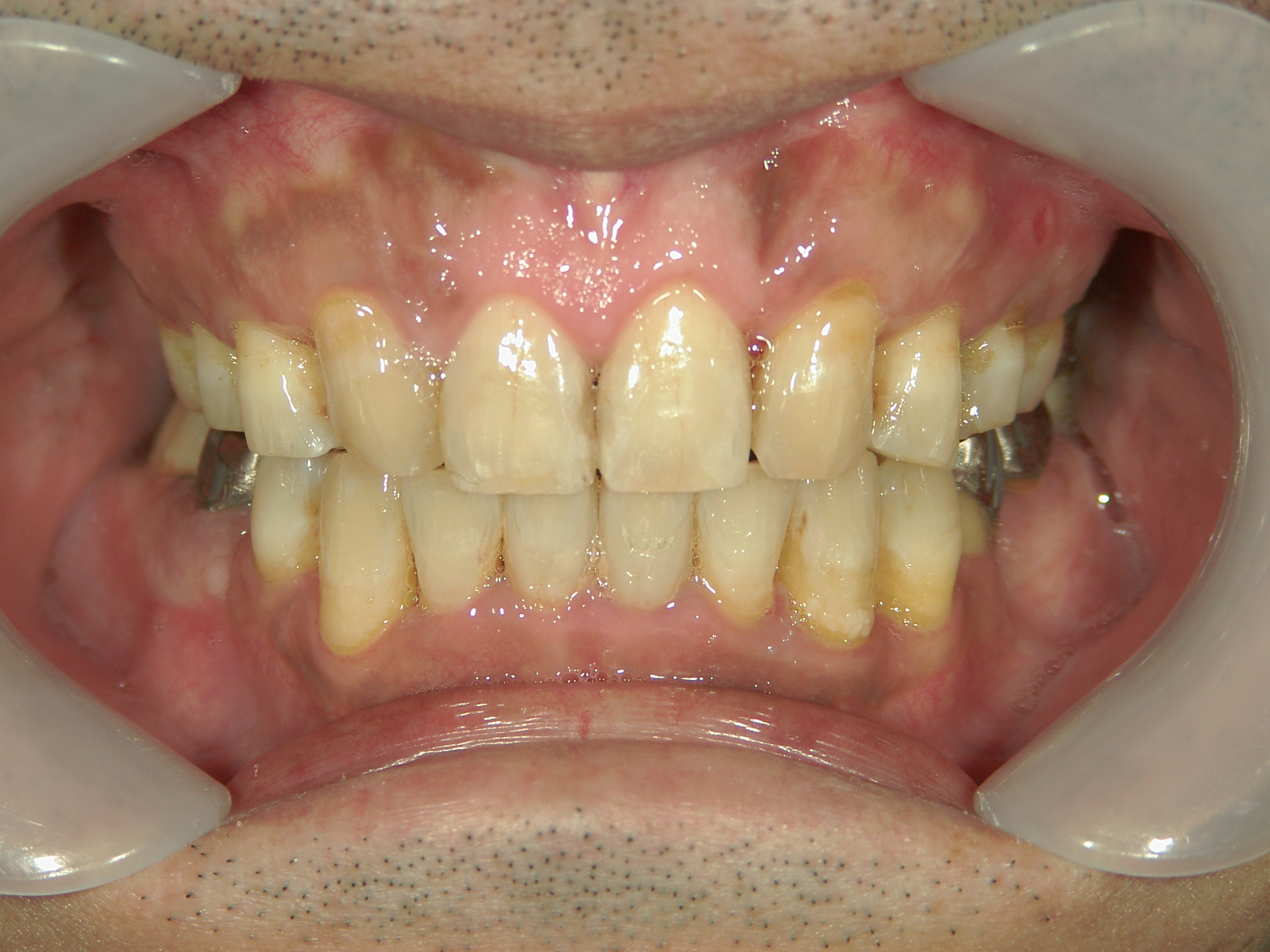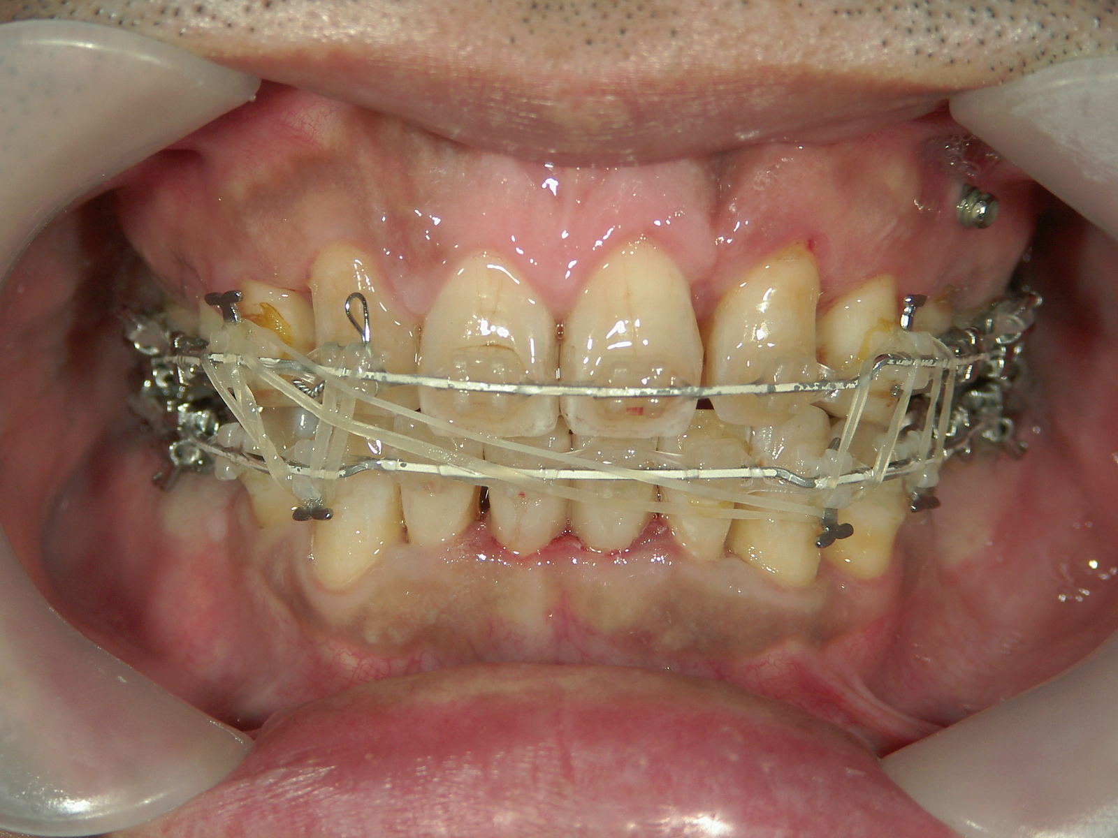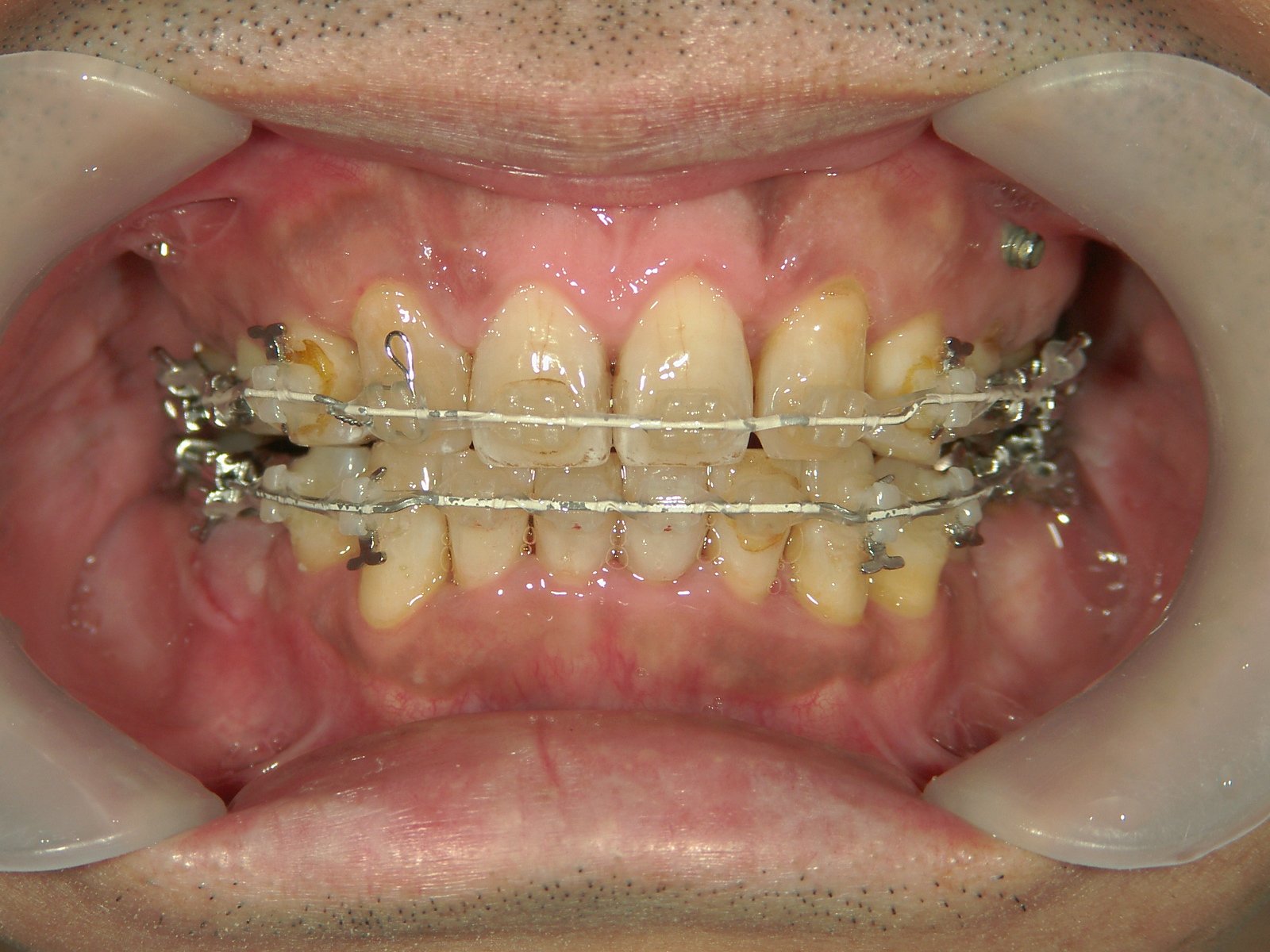 右上前歯1本 欠損、左上前歯1本、右下 第二小臼歯1本を抜歯。