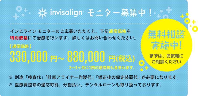 インビザラインは金属ではなく透明な器具を使用しているため目立ちにくいですし、取り外し可能なので大切な用事があるときは外すこともできます。また、従来の矯正器具に比べて凹凸が少なく、装着したときの痛みや違和感も比較的少ないです。人前に出る仕事をしている方や結婚式を控えている方や結婚式を控えていえる方、従来のブラケット矯正が合わずに悩んでいる方にもおすすの矯正治療です。